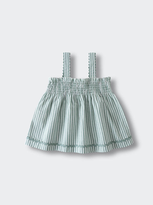 Child wearing a sleeveless top with lemon pattern against a neutral background