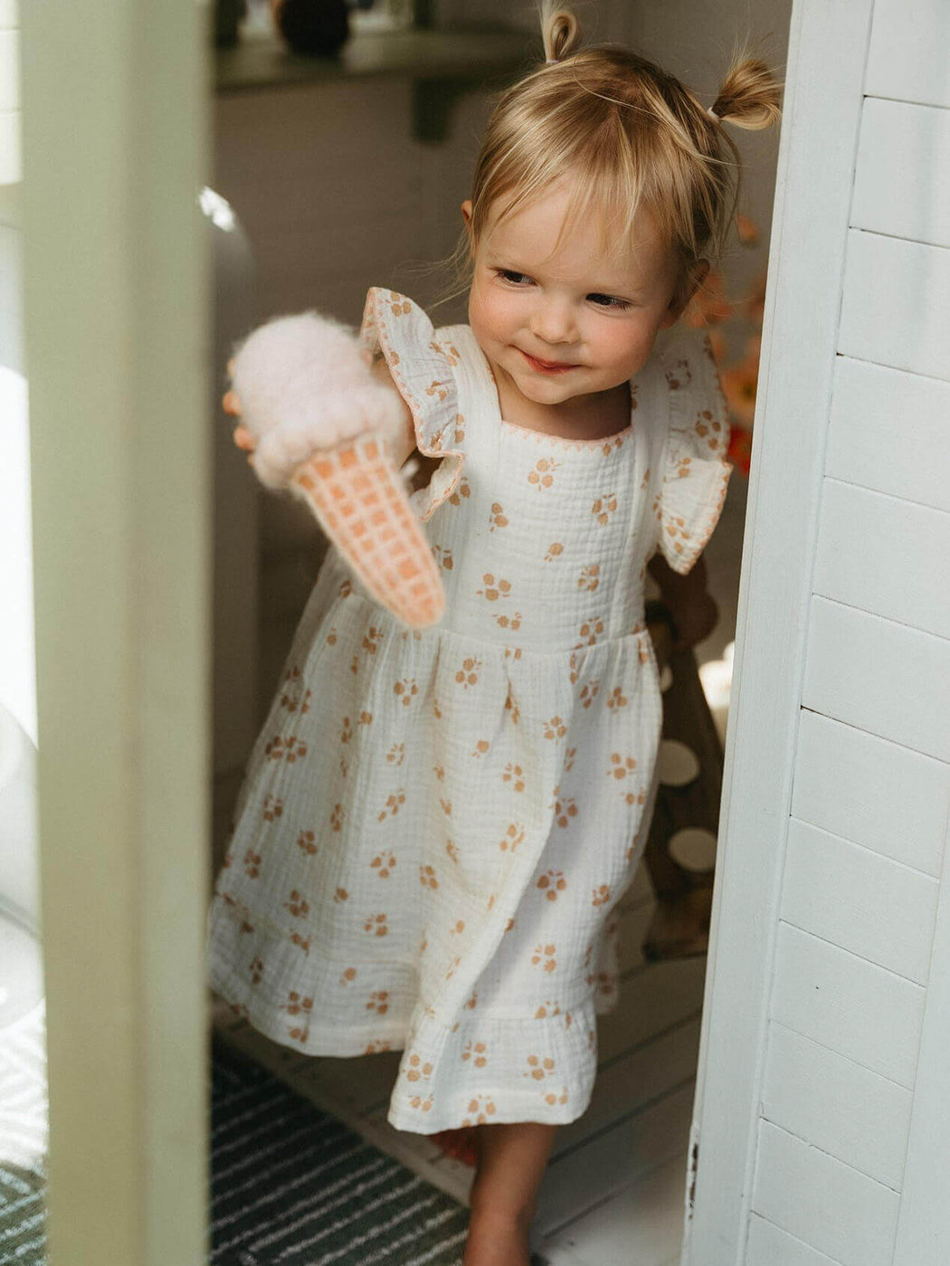 Child in a white dress with orange apples  standing on a stool inside a playhouse.